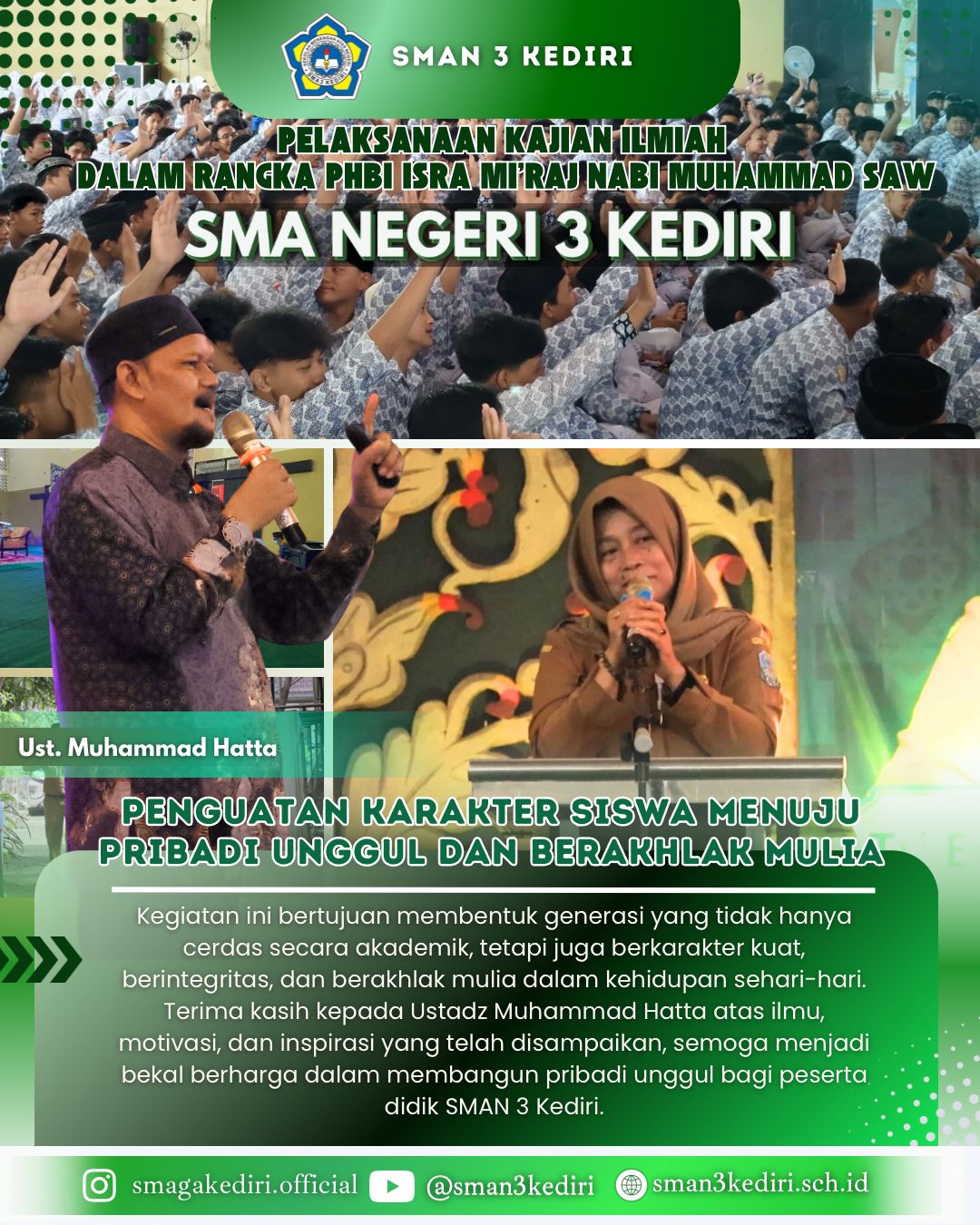 Melalui kegiatan ini, SMA Negeri 3 Kediri menegaskan komitmennya dalam membentuk karakter siswa menuju pribadi unggul dan berakhlak mulia. Kegiatan kajian ilmiah tidak hanya bertujuan meningkatkan pemahaman keagamaan, tetapi juga menanamkan nilai-nilai moral dan spiritual yang dapat diterapkan dalam kehidupan sehari-hari, baik di lingkungan sekolah, keluarga, maupun masyarakat.