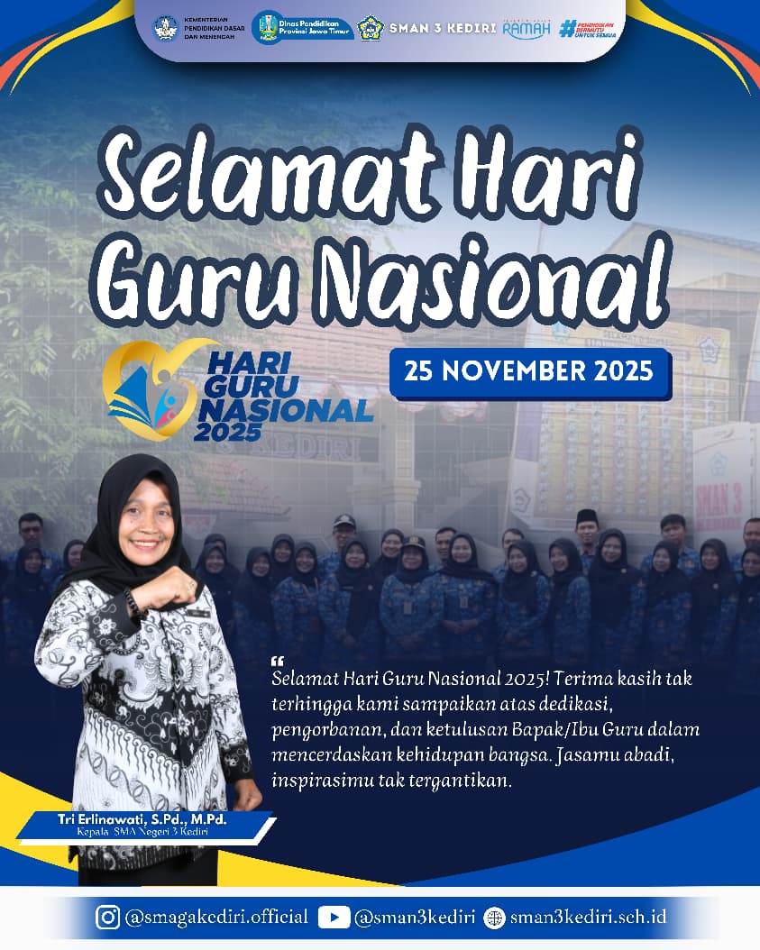 SMAN 3 Kediri mengapresiasi seluruh guru yang terus meningkatkan kompetensi, mengembangkan metode pembelajaran kreatif, dan mendampingi siswa dengan penuh kesabaran serta profesionalisme.